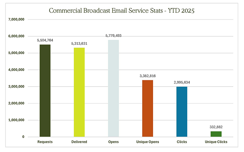 In 2025, more emails were sent through the CBES than ever before. There were over 5.5 million requests sent, resulting in over 5.7 million opens and nearly 3.4 million unique opens!